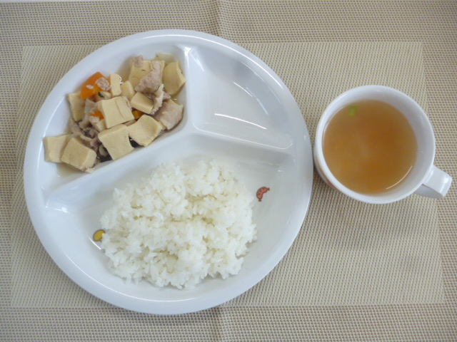 今日の給食は「ごはん」「凍豆腐の中華炒め煮」「玉葱と青ねぎのスープ」です。 おやつは「牛乳」「マリービスケット」「揚げせんべい」です。