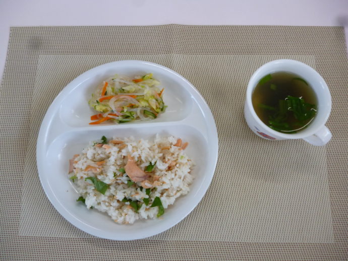 今日の給食は、「鮭ごはん」、「伴三糸」と「すまし汁」 おやつは、「牛乳」、「ココア蒸しまんじゅう」と「ソフトせんべい」です。