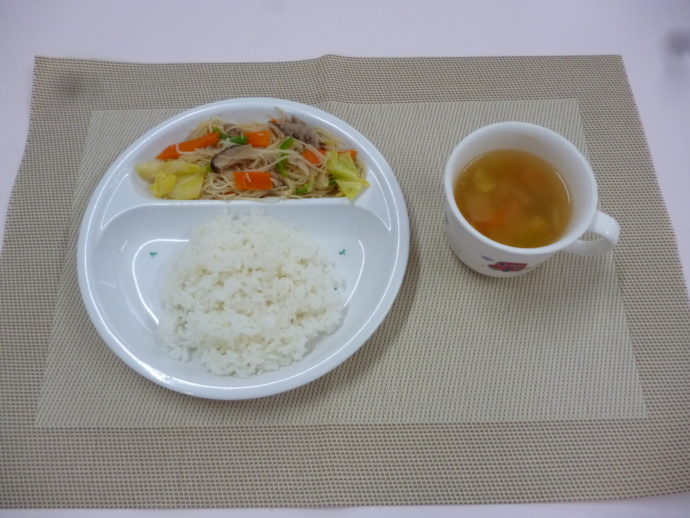今日の給食は、「五目ビーフン」と「豆腐と野菜のスープ」