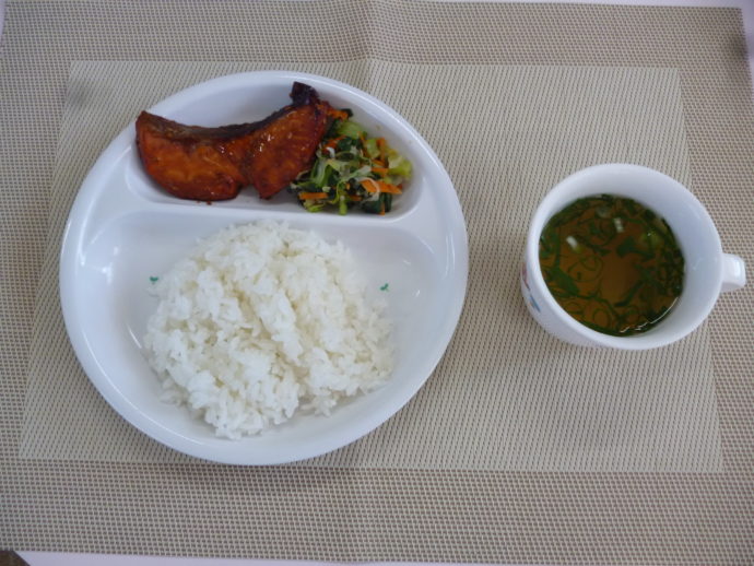 今日の給食は、「鮭の味噌焼き」、「チンゲン菜のおかか和え」と「湯葉と玉ねぎのすまし汁」 おやつは、「牛乳」、「バナナ」と「えびちび」です。