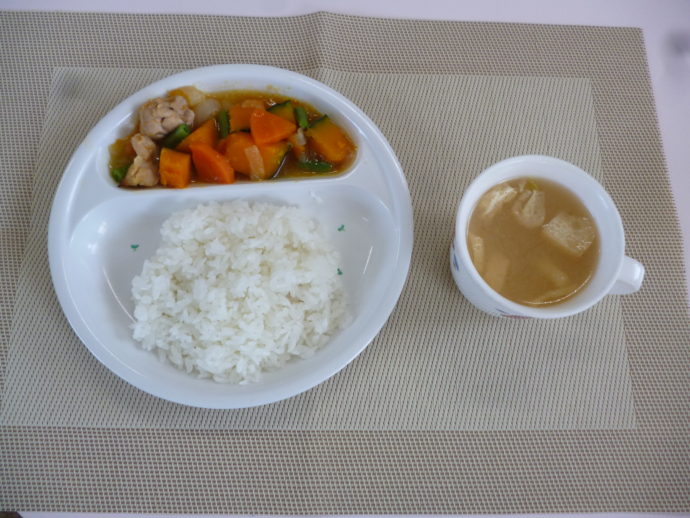 今日の給食は、「南瓜の鶏肉炒り煮」と「味噌汁」