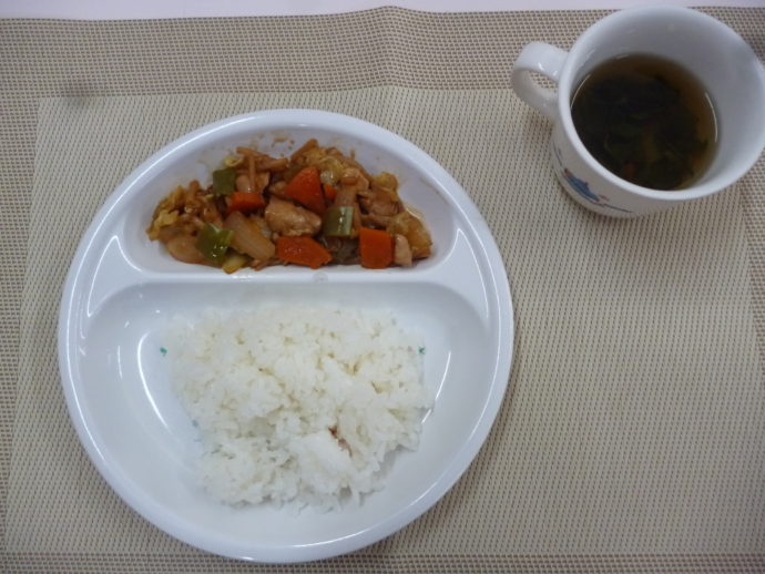 今日の給食は、「鶏肉と野菜の味噌炒め」と「青菜のすまし汁」 おやつは、「牛乳」、「みかん缶」と「ハッピーターン」です。
