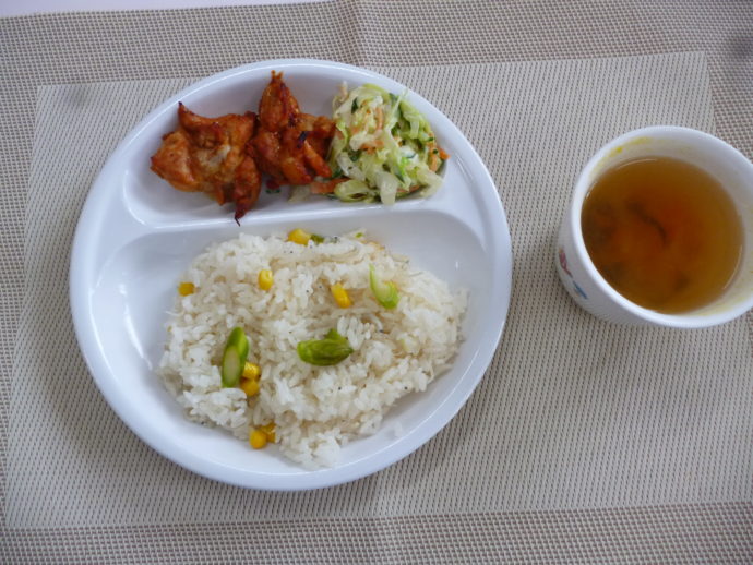 令和元年6月5日(水)の献立 2019/06/05 今日はお誕生日会です🍰 6月生まれのお友達、お誕生日おめでとう✨ 今日の給食は、「アスパラごはん」、「タンドリー風味チキン」、「ドレッシングサラダ」と 「玉葱とわかめのスープ」 おやつは、「牛乳」、「ピーチ豆乳寒天」と「せんべい」です。