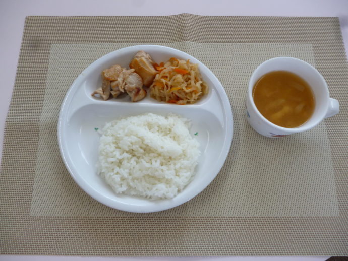 今日の給食は、「鶏の桑焼き」、「切干大根の煮付け」と「味噌汁」