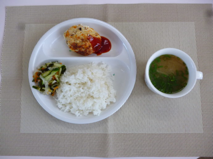 今日の給食は、「豆腐のつくね焼」、「酢の物」と「具沢山味噌汁」