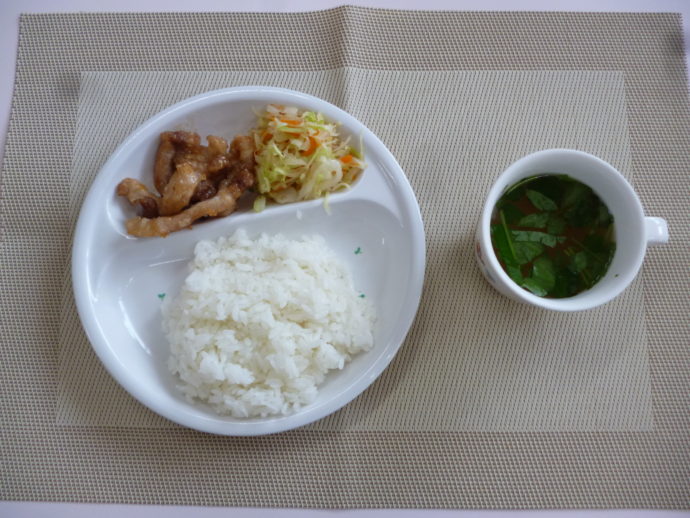 今日の給食は、「豚肉のかりん揚げ」、「キャベツのおかか和え」と「湯葉とみつばのすまし汁」