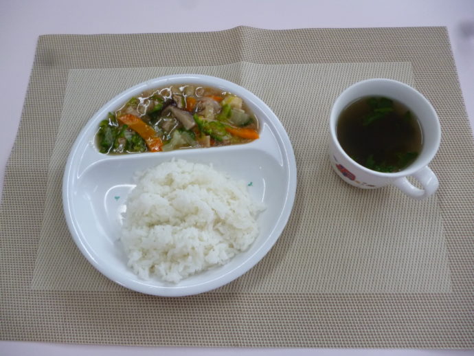 今日の給食は、「八宝菜」と「春雨スープ」 おやつは、「牛乳」、「杏仁豆腐風」と「ハッピーターン」です。