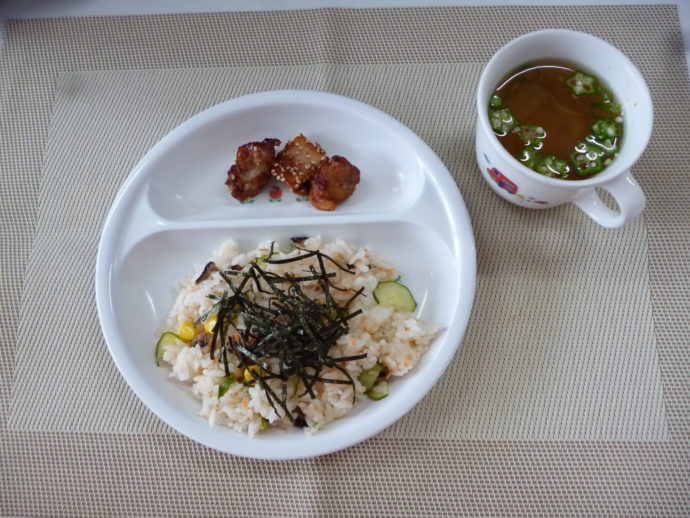 今日の給食は、「ちらし寿司」、「鶏肉のごまみそ焼き」と「七夕スープ」 おやつは、「牛乳」、「きらきらゼリー」と「星食べよう」です。