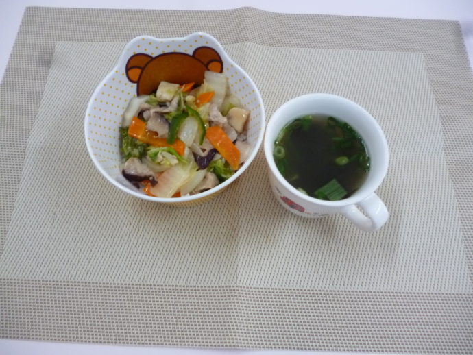 今日の給食は、「八宝菜」と「春雨スープ」 おやつは、「牛乳」、「杏仁豆腐風」と「ハッピーターン」です。