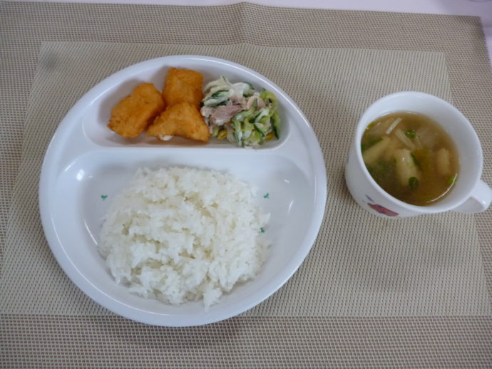 今日の給食は、「カレイの竜田揚げ」、「大根とツナの和え物」と「白菜の味噌汁」 おやつは、「牛乳」、「マカロニきなこ」と「ソフトサラダ」です。
