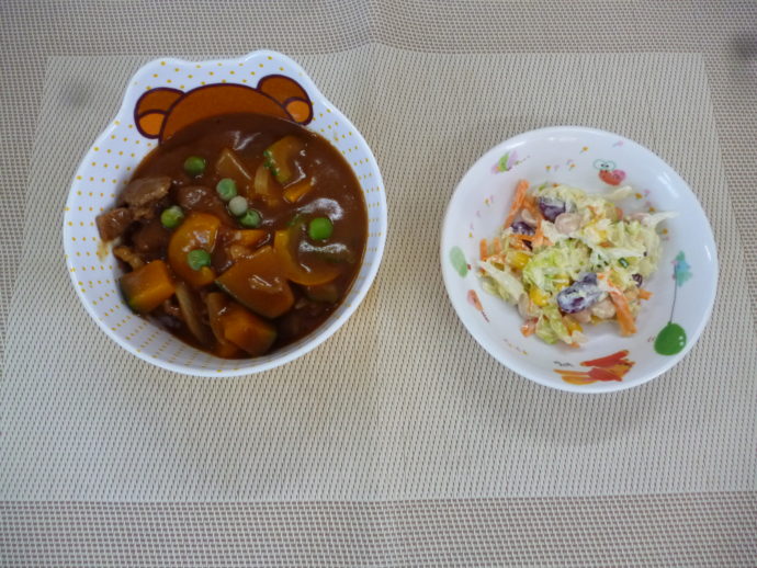 今日の給食は、「夏野菜カレー」と「ひよこ豆のサラダ」