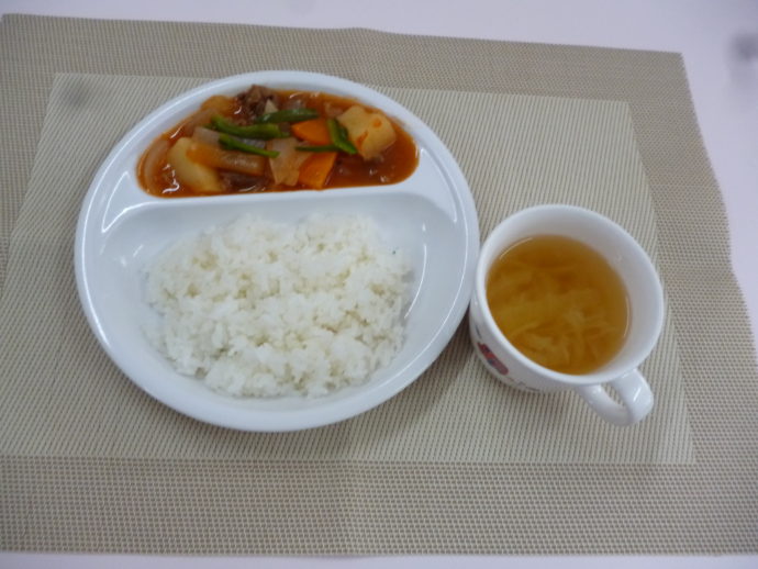 今日の給食は、「牛肉と野菜のケチャップ煮」と「野菜スープ」 おやつは、「牛乳」と「お楽しみおやつ」です。