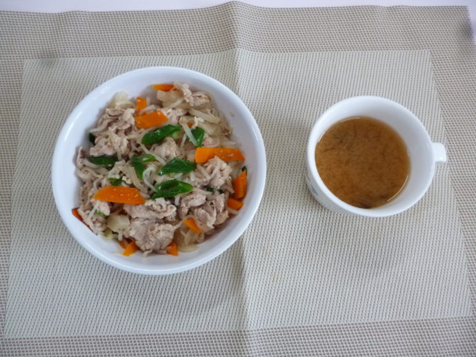 今日の給食は、「豚丼」と「大根のみそ汁」 おやつは、「牛乳」、「プチゼリー」と「おにぎりせんべい」です。