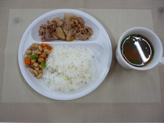 今日の給食は、「豚肉のしょうが焼き」、「五目煮豆」と「豆腐のみそ汁」