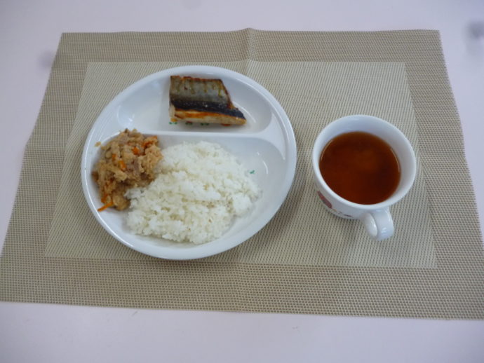 今日の給食は、「アジの塩焼き」、「卯の花炒り」と「じゃが芋の味噌汁」