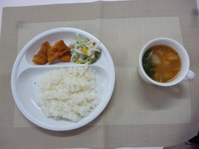 今日の給食は、「カレイの竜田揚げ」、「大根とツナの和え物」と「白菜のみそ汁」 おやつは、「牛乳」、「マカロニきなこ」と「ソフトサラダ」です。