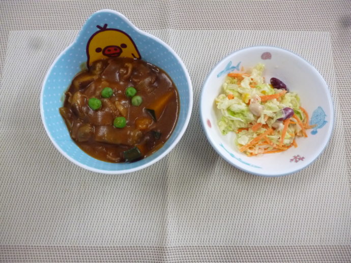 今日の給食は、「夏野菜カレー」と「ひよこ豆のサラダ」 おやつは、「牛乳」、「バナナ」と「おにぎりせんべい」です。