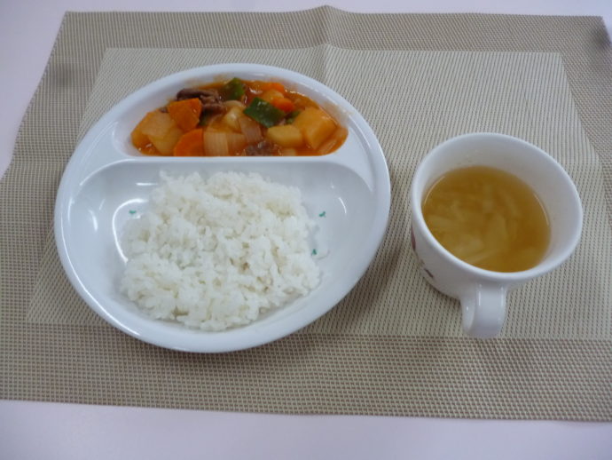 今日の給食は、「牛肉と野菜のケチャップ煮」と「野菜スープ」 おやつは、「牛乳」と「お楽しみおやつ」です。