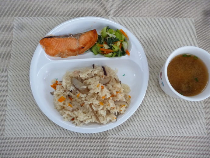 令和元年9月2日(月)の献立 2019/09/02 今日の給食は、「炊き込みごはん」、「鮭の南部焼き」、「チンゲン菜のおかか和え」と 「豆腐のみそ汁」 おやつは、「牛乳」、「りんご」と「ぽたぽた焼」です。