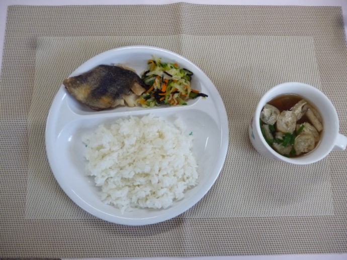 今日の給食は、「ほっけの塩焼き」、「キャベツの磯和え」と「けんちん汁」