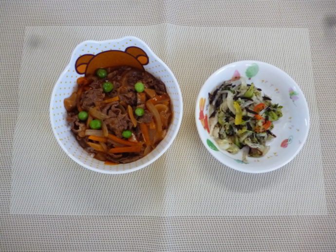 今日の給食は、「ハヤシライス」と「ひじきとキャベツのサラダ」