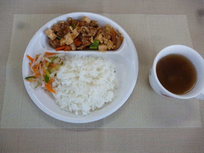 今日の給食は、「豚肉と豆腐の味噌炒め」、「三色なます」と「もずくスープ」