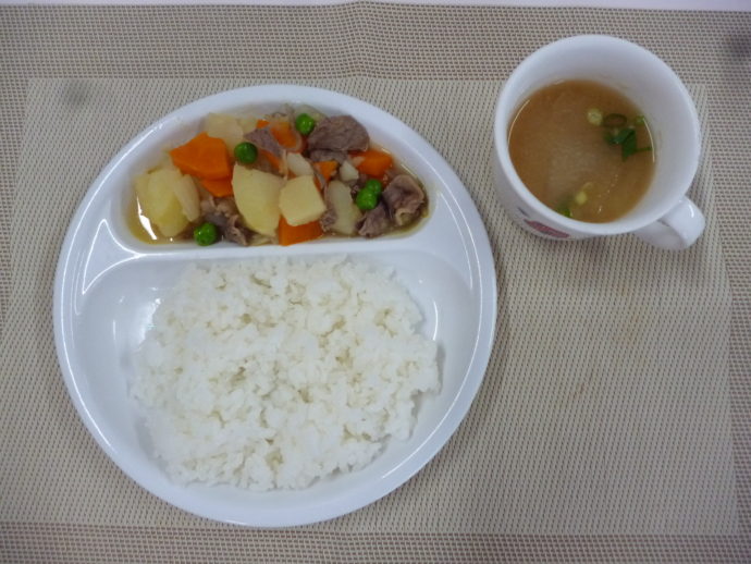 今日の給食は、「カレー肉じゃが」と「大根となめこの味噌汁」 おやつは、「牛乳」と「お楽しみおやつ」です。