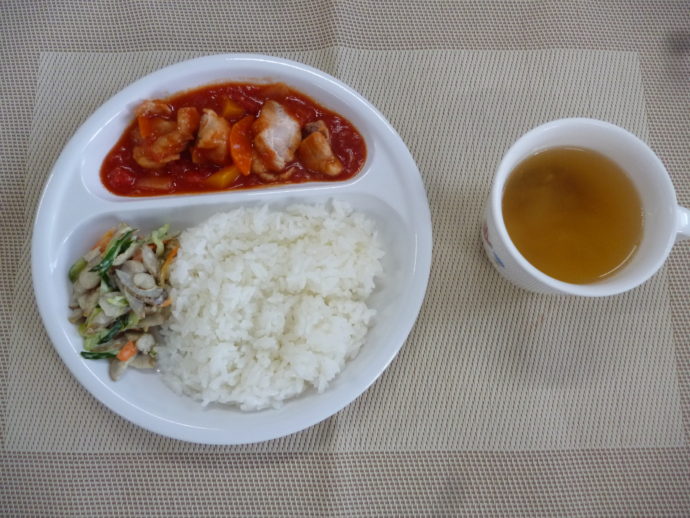 今日の給食は、「鶏肉のトマト煮」、「ごぼうサラダ」と「オニオンスープ」 おやつは、「牛乳」、「ホットケーキ」と「アスパラガスビスケット」です。