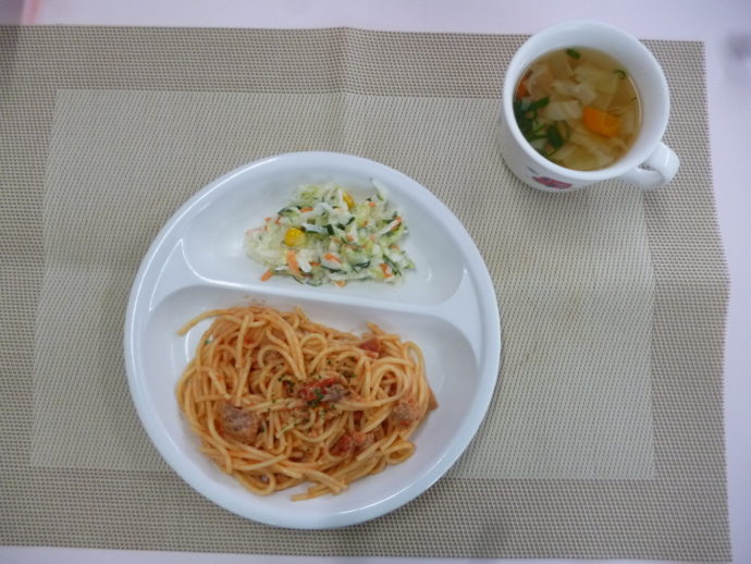 今日の給食は、「ツナとトマトのパスタ」、「大根サラダ」と「コンソメスープ」