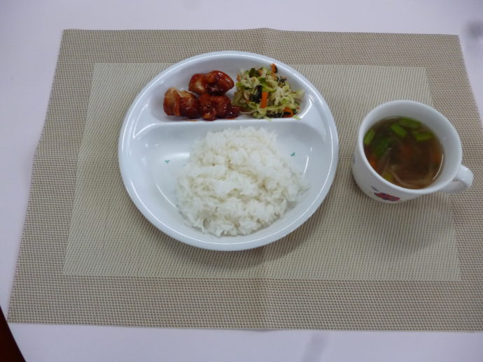 令和元年12月5日(木)の献立 2019/12/05 今日の給食は、「鶏肉のケチャップ和え」、「和風サラダ」と「切り干し大根のスープ」 おやつは、「牛乳」、「さつまいももち」と「ハッピーターン」です。 おやつの「さつまいももち」は、ほし組さんがさつまいもをつぶしてくれました!
