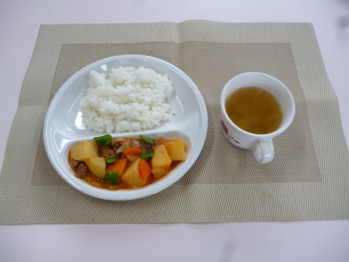 今日の給食は、「牛肉と野菜のケチャップ煮」と「野菜スープ」