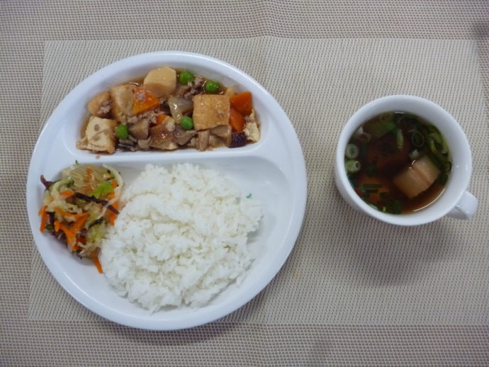 今日の給食は、「厚揚げのそぼろ煮」、「バンサンス」と「麩のすまし汁」 おやつは、「牛乳」、「オレンジ」と「じゃこ揚げせん」です。