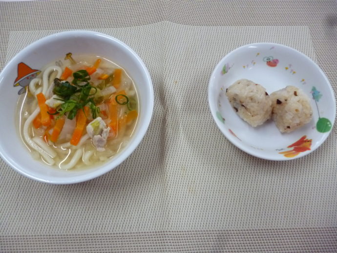 今日の給食は、「けんちんうどん」と「昆布おにぎり」 おやつは、「牛乳」と「お楽しみおやつ」です。
