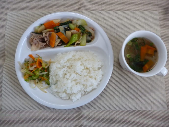 今日の給食は、「豚肉のオイスターソース炒め」、「中華風サラダ」と「春雨スープ」 おやつは、「牛乳」、「りんご」と「白い風船」です。
