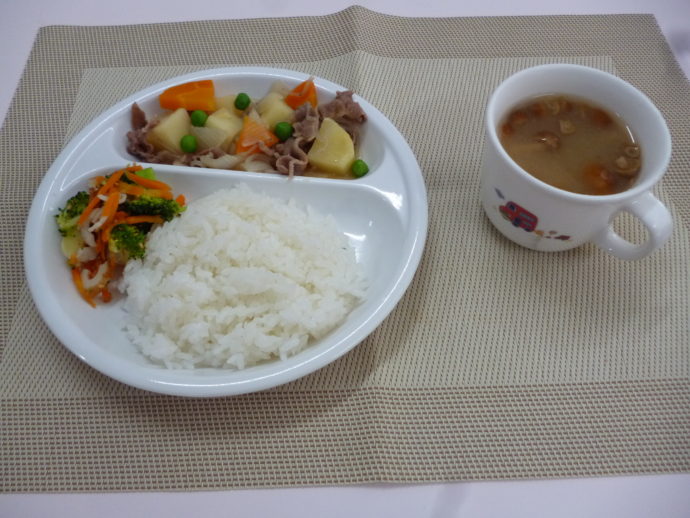 今日の給食は、「肉じゃが」、「ブロッコリーのごま酢あえ」と「なめこのみそ汁」 おやつは、「牛乳」、「リンゴ」と「きなこ餅せんべい」です。
