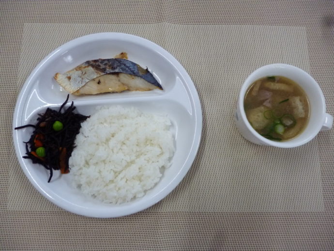 今日の給食は、「さわらのバター醤油焼き」、「ひじきの煮物」と「豚汁」 おやつは、「お茶」と「五平もち」です。