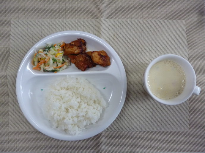 今日の給食は、「鶏肉のごまみそ焼き」、「大根とツナのサラダ」と「クラムチャウダー」 おやつは、「牛乳」、「ココア寒天」と「ハッピーターン」です。