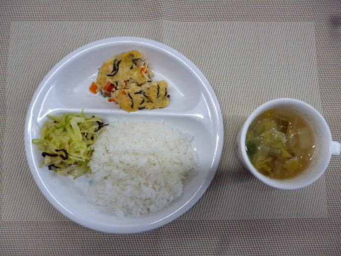 今日の給食は、「擬製豆腐」、「キャベツの昆布和え」と「白菜のみそ汁」