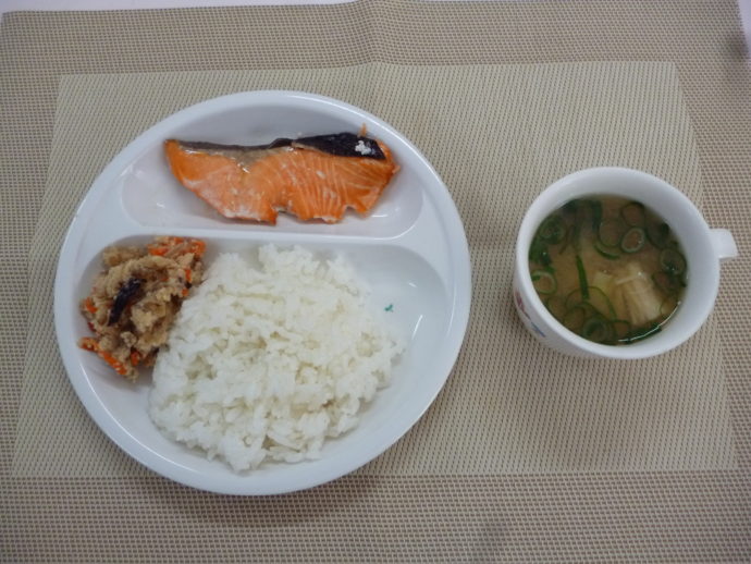今日の給食は、「鮭の塩焼き」、「卯の花炒り」と「キャベツのみそ汁」 おやつは、「牛乳」と「きなこ揚げパン」です。