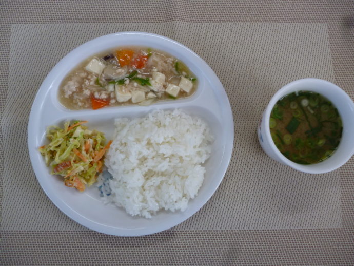 今日の給食は、「豆腐のきのこあんかけ」、「キャベツのごまマヨネーズ和え」と「玉ねぎのみそ汁」 おやつは、「牛乳」、「バナナ」と「ポンスケ」です。