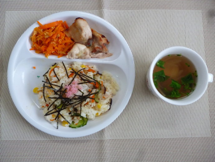 今日の給食は、「ちらし寿司」、「鶏肉のマーマレード焼き」、「にんじんしりしり」と「菜の花のすまし汁」