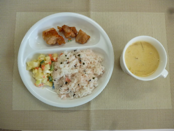 令和2年3月23日(月)の献立 2020/03/23 今日は卒園お祝いメニューです! 今日の給食は、「鶏のから揚げ」、「マセドアンサラダ」と「コーンスープ」 おやつは、「牛乳」、「いちごミルク寒」と「ハッピーターン」です。