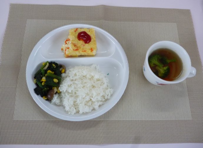 今日の給食は、「豆腐のピカタ」、「ほうれん草とコーンのソテー」と「コンソメスープ」 おやつは、「牛乳」、「いちご」と「ハッピーターン」です。