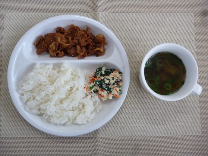 今日の給食は、「豚肉のみそ焼き」、「白和え」と「キャベツのすまし汁」