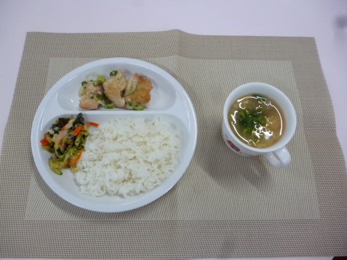今日の給食は、「鶏肉のレモン醤油焼き」、「キャベツの和風和え」と「白菜のみそ汁」