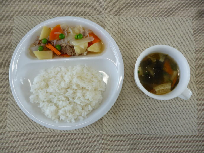 令和2年5月1日(金)の献立 2020/05/01 5月も原則休園となるため、引き続き臨時献立となります。 ご理解の程よろしくお願いいたします。 今日の給食は、「肉じゃが」と「油揚げとわかめのみそ汁」 おやつは、「牛乳」と「お楽しみおやつ」です。