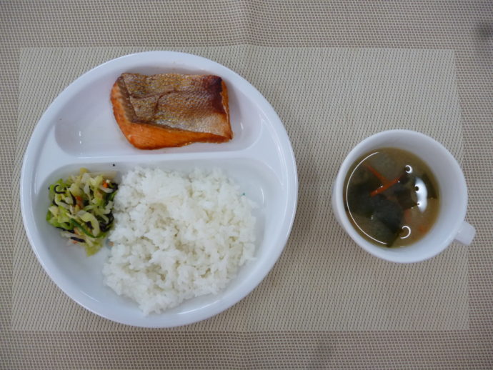 今日の給食は、「鮭の塩焼き」、「キャベツの磯部和え」と「玉ねぎのみそ汁」 おやつは、「牛乳」と「お楽しみおやつ」です。