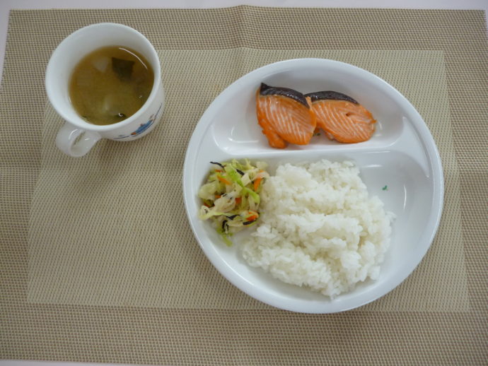 今日の給食は、「鮭の塩焼き」、「キャベツの磯部和え」と「玉ねぎのみそ汁」 おやつは、「牛乳」と「お楽しみおやつ」です。
