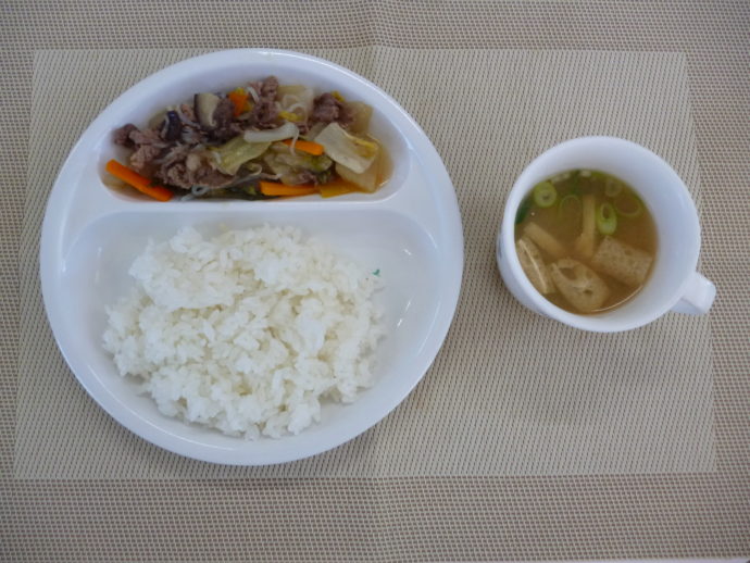 今日の給食は、「すき焼き煮」と「豆腐のみそ汁」 おやつは、「牛乳」と「お楽しみおやつ」です。