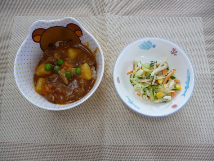 令和2年6月1日(月)の献立 2020/06/01 家庭保育のご協力をお願いしていますが、今日から再開となりました! またみんなに会えることができてとてもうれしいです! 原則休園中は、臨時献立にご理解いただき、ありがとうございました。 今日の給食は、「カレーライス」と「大根サラダ」 おやつは、「牛乳」、「りんご」と「ポン菓子」です。